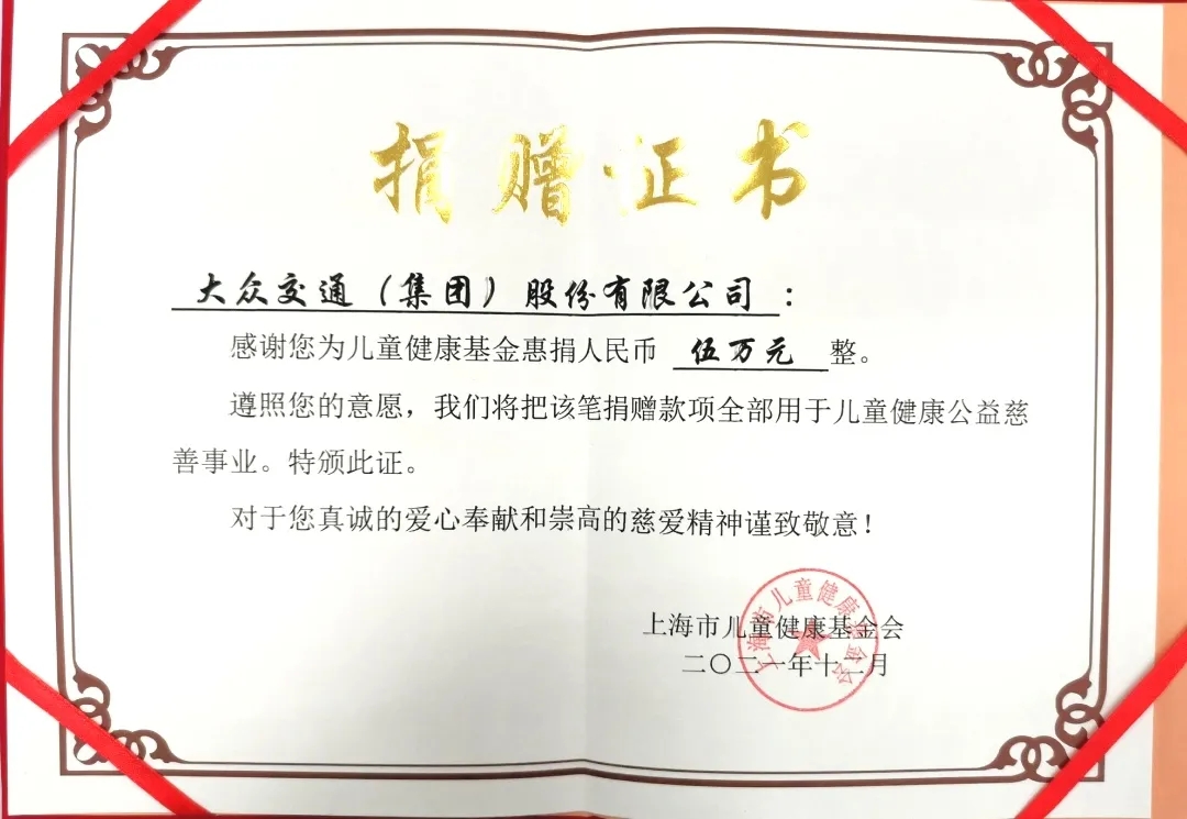儿童健康,关乎未来。在公司成立33周年司庆之际,博天堂AG交通(集团)股份有限公司向上海儿童健康基金会捐款伍万元,支持基金会积极拓展关爱儿童的慈善公益活动。